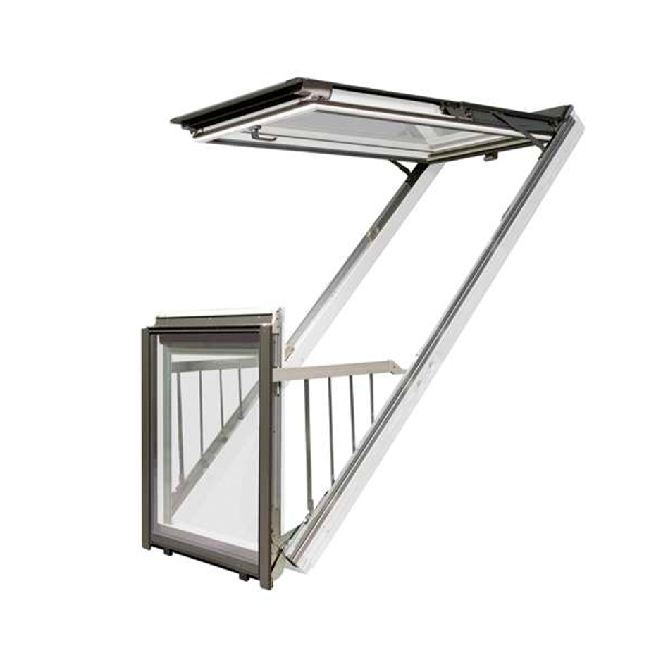 Innovative, large roof window in which the open sashes create a balcony. The upper sash is opened upwards, the lower forward allowing easy access to the balcony bay.